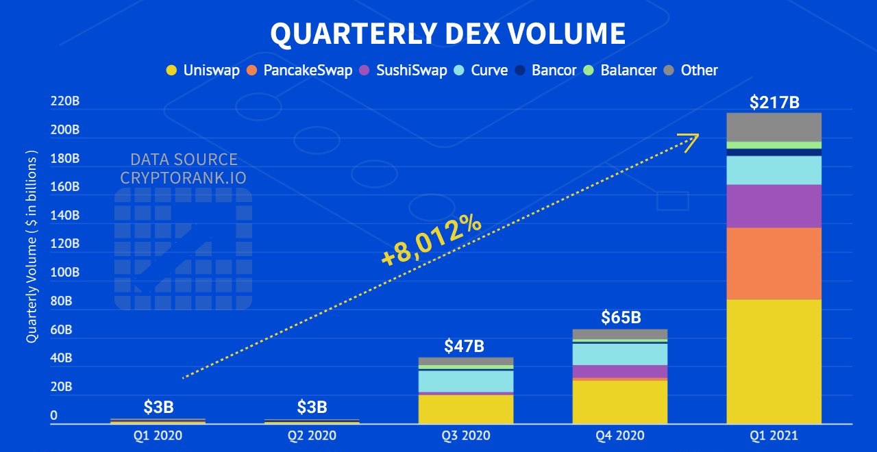 Общий объём децентрализованных бирж (DEX) в этом квартале достиг $217 млрд💰