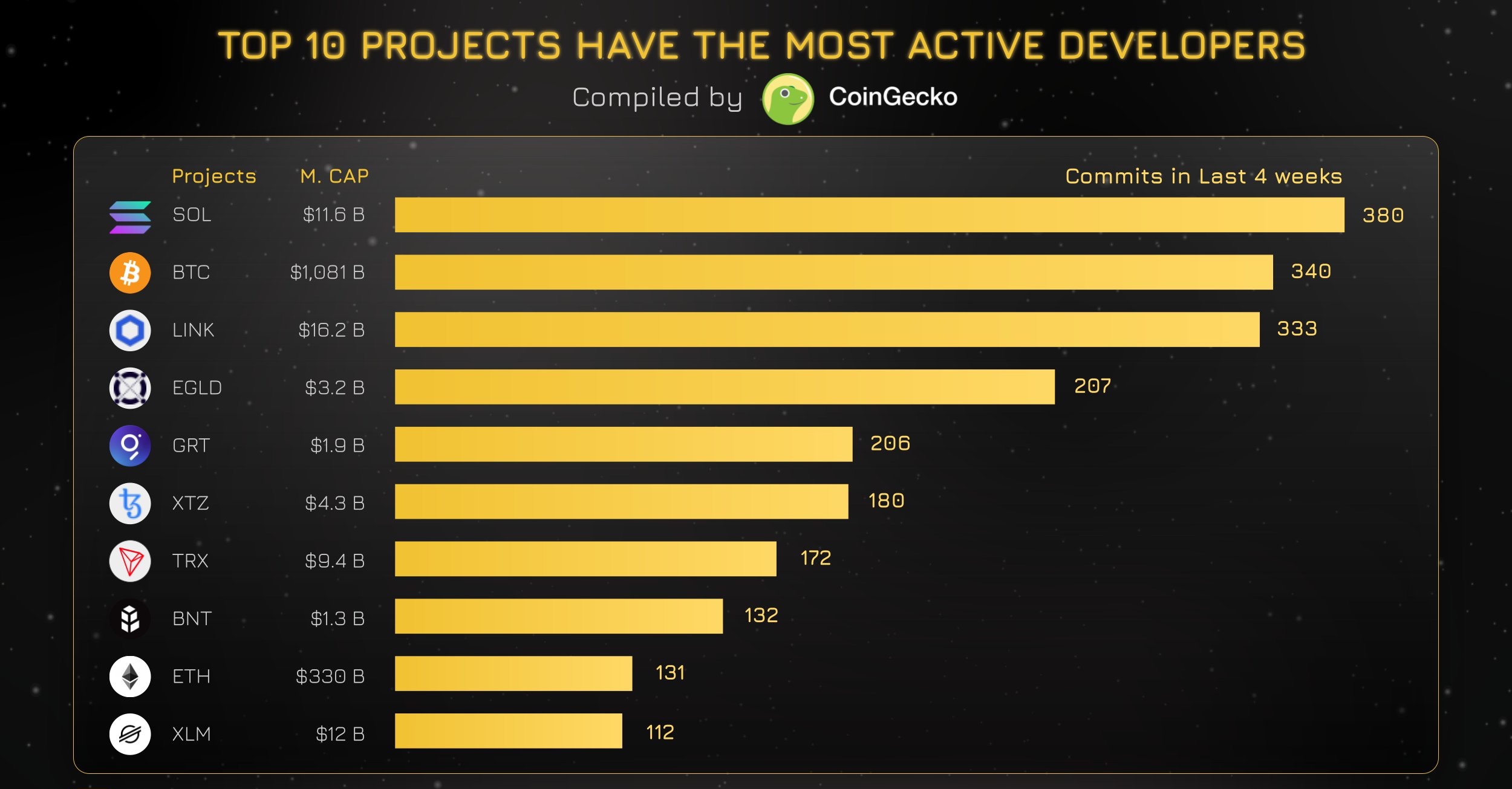 Не зря у проекта #Solana по статистике самая активная команда разработчиков, их блокчейн лидирует практически по всем показателям. А именно: самая быстрая скорость создания блока 0.4с, количество транзакций 50000 в секунду, самая низкая комиссия и самое большое количество транзакций.