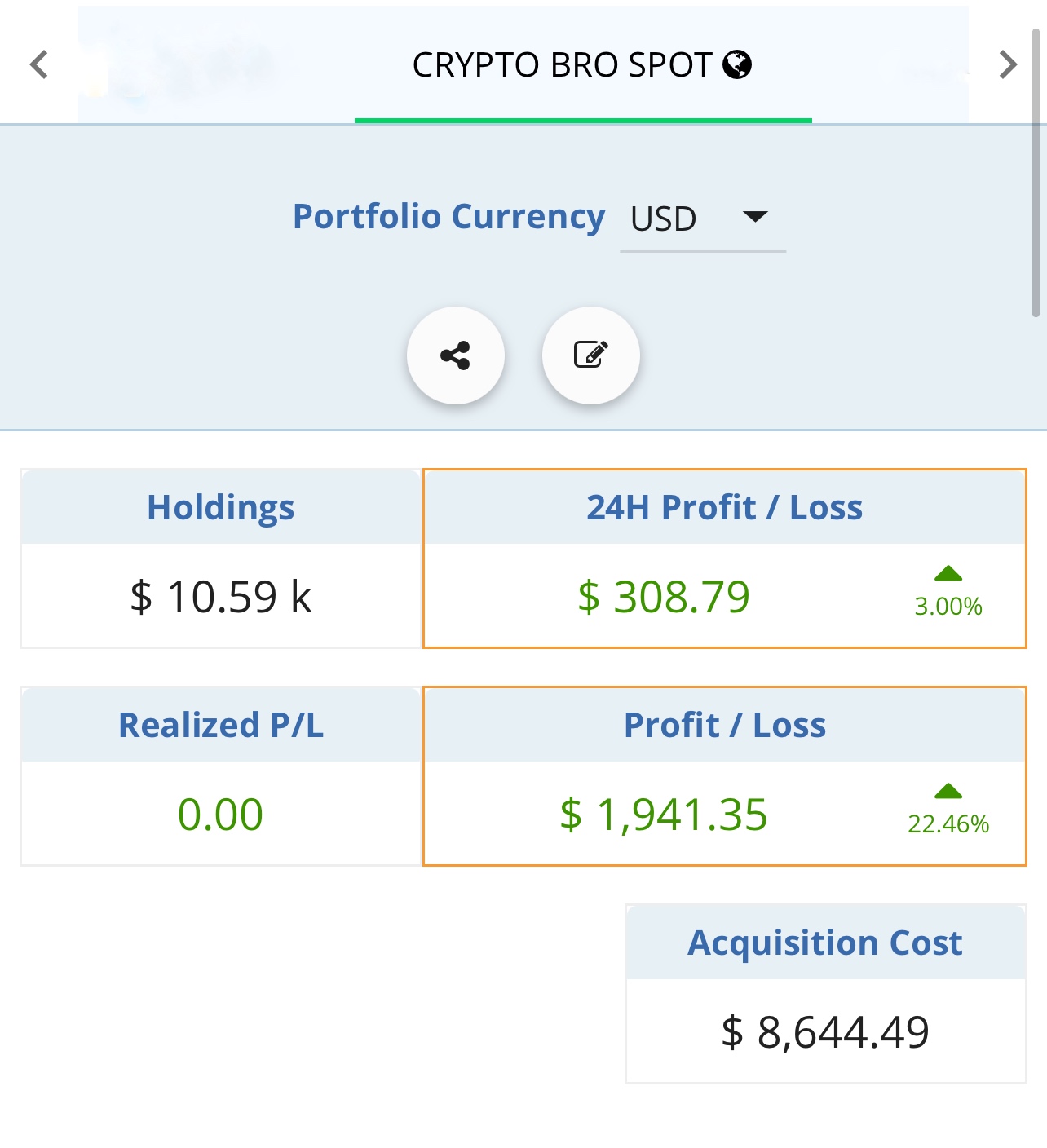 Собственно что касательно портфолио на 10000 USDT - я начал покупать монеты 6 дней назад и уже сейчас процент общей доходности составляет ~22%, а это +1900 USDT💸