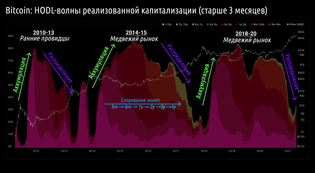HODL-волны реализованной капитализации показывают аккумуляцию, созревание монет и реализацию прибыли.