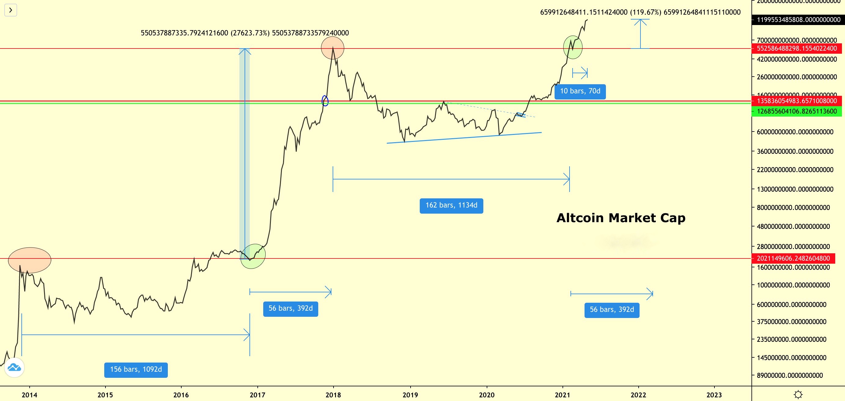 В своем твите от 3 мая Rekt Capital отметил, что в начале 2017 года рыночная капитализация альткоинов перевернула максимум предыдущего цикла в сторону поддержки. Этот максимум был достигнут в конце 2013 года, и, став новым уровнем пола, он запустил капитализацию рынка на пик, превышающий его не менее чем на 27 623%.