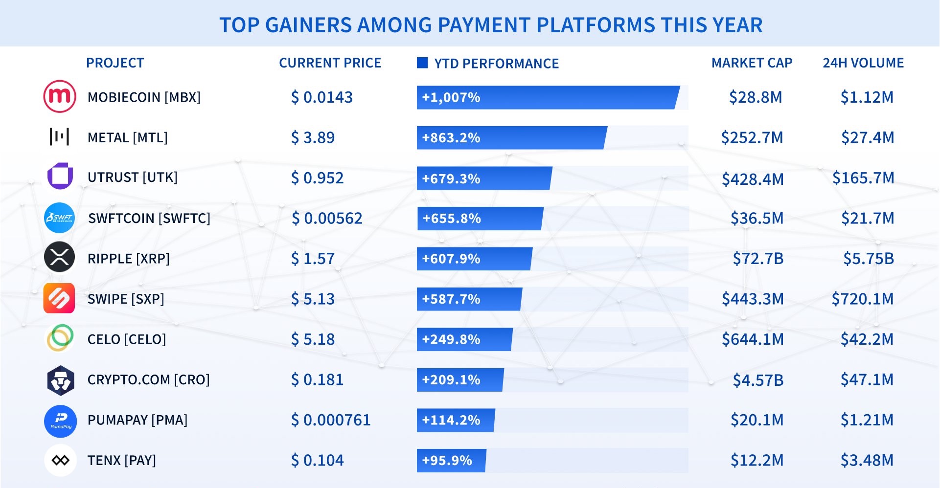 Рейтинг токенов платёжных платформ по годовому росту📊