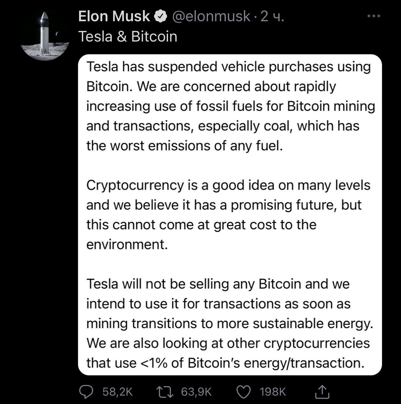 Tesla не будет продавать биткоин, и мы намерены использовать его для транзакций, как только майнинг перейдет на более экологичные виды энергии. Мы также рассматриваем другие криптовалюты, которые используют менее 1% энергии биткоина.