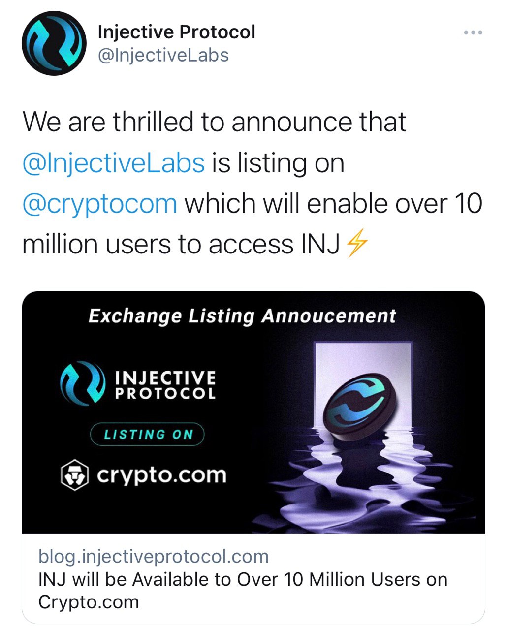 Токен будет листиться на платформе Crypto.com, что даст доступ к возможностям INJ более чем 10 миллионнам пользователей🚀