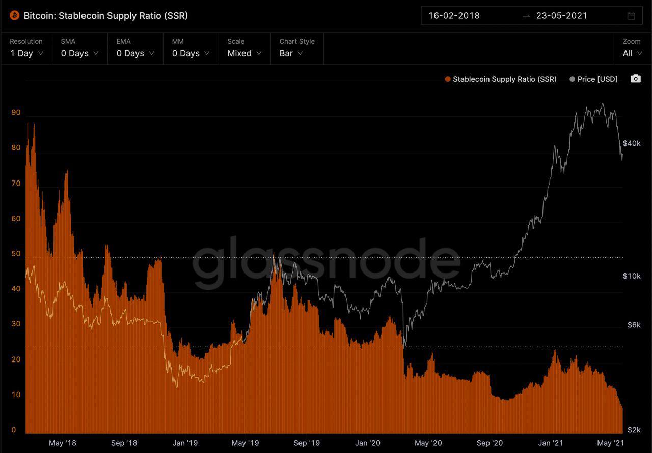 Обеспечение (Supply ratio) битка стейблкоинами исторически снижается. Это означает все меньшую зависимость цены от выпуска новых стейблов.🔀