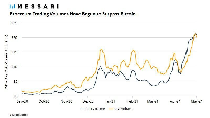 Объемы торговли ETH в последнее время резко возросли и за последний месяц превзошли объемы BTC.📊