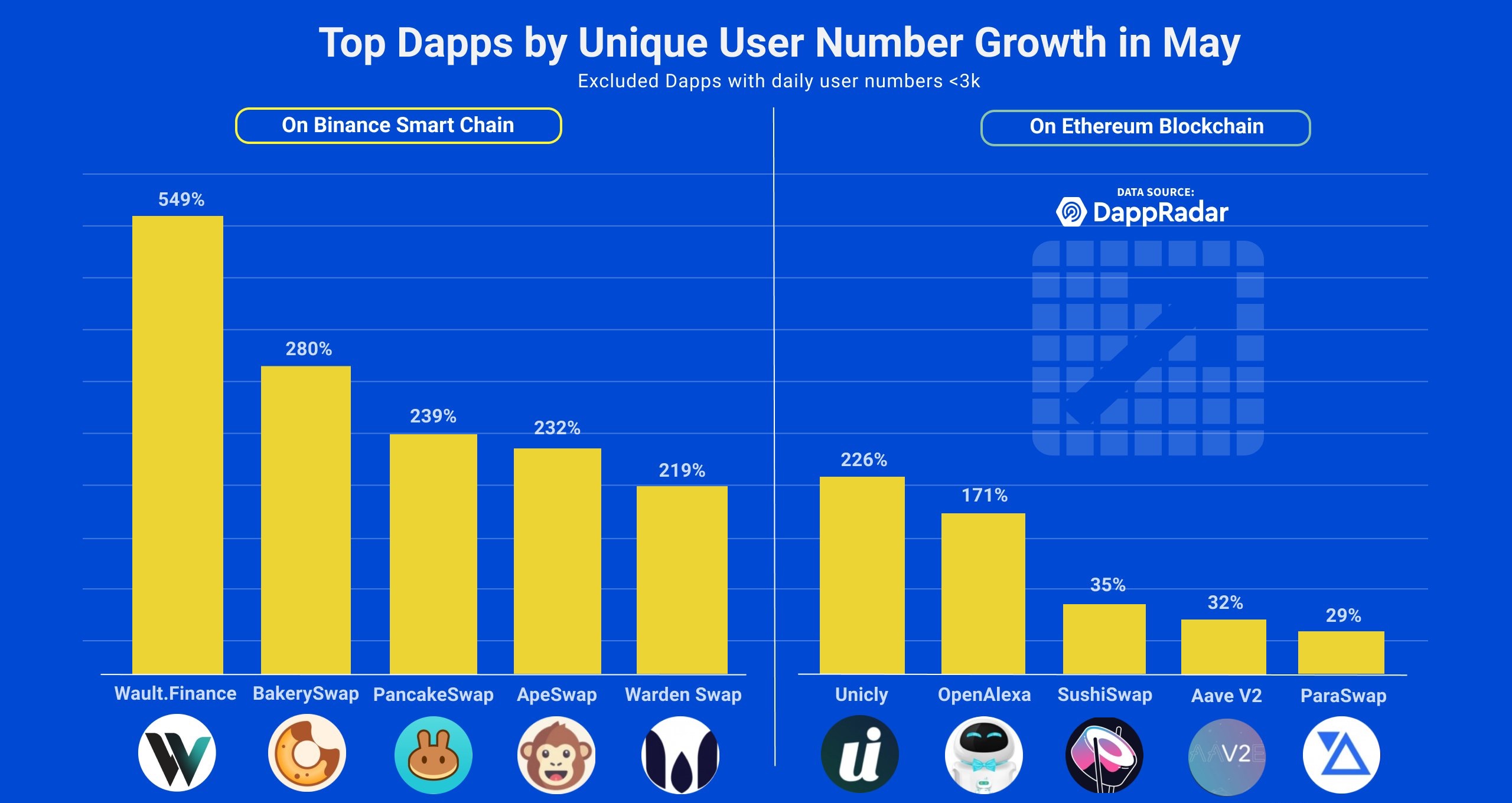 Топ децентрализованных приложений (DApps) по росту числа уникальных пользователей в мае из сетей #Binancesmartchain и #Ethereum 👥