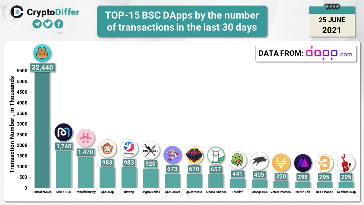 Топ 15 DApps из блокчейна #BinanceSmartChain по количеству транзакций (в тысячах) за последние 30 дней🧐