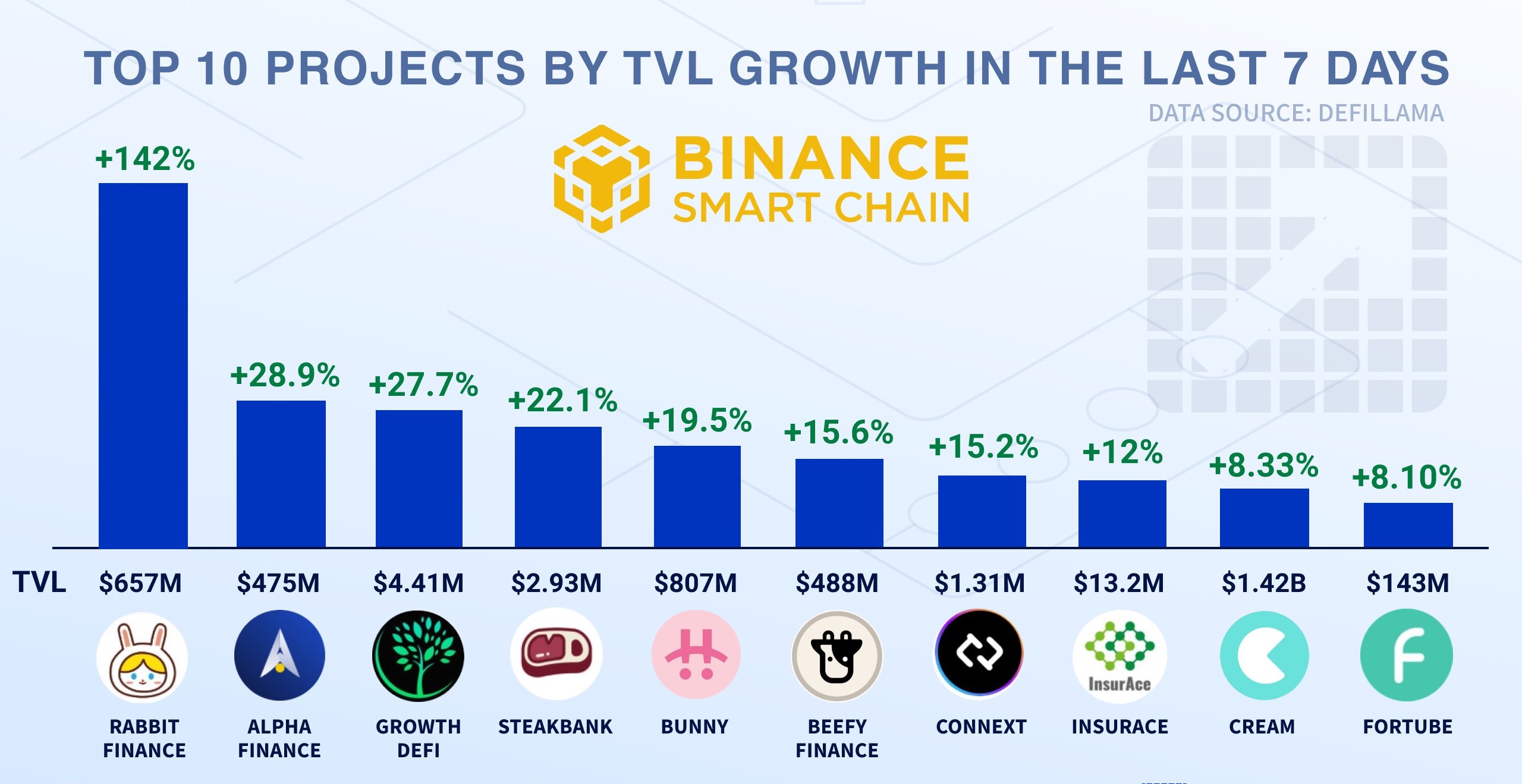 Топ 10 проектов из сети #BinanceSmartChain по росту TVL (объема заблокированных средств) за последние 7 дней📈