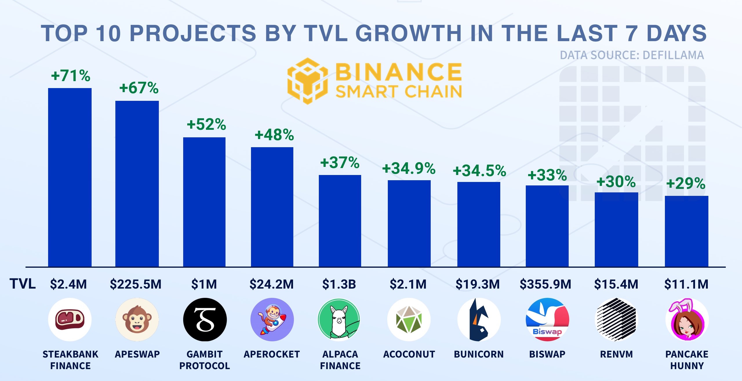 Топ 10 проектов по росту TVL (объема заблокированных средств) в сети Binance Smart Chain📈