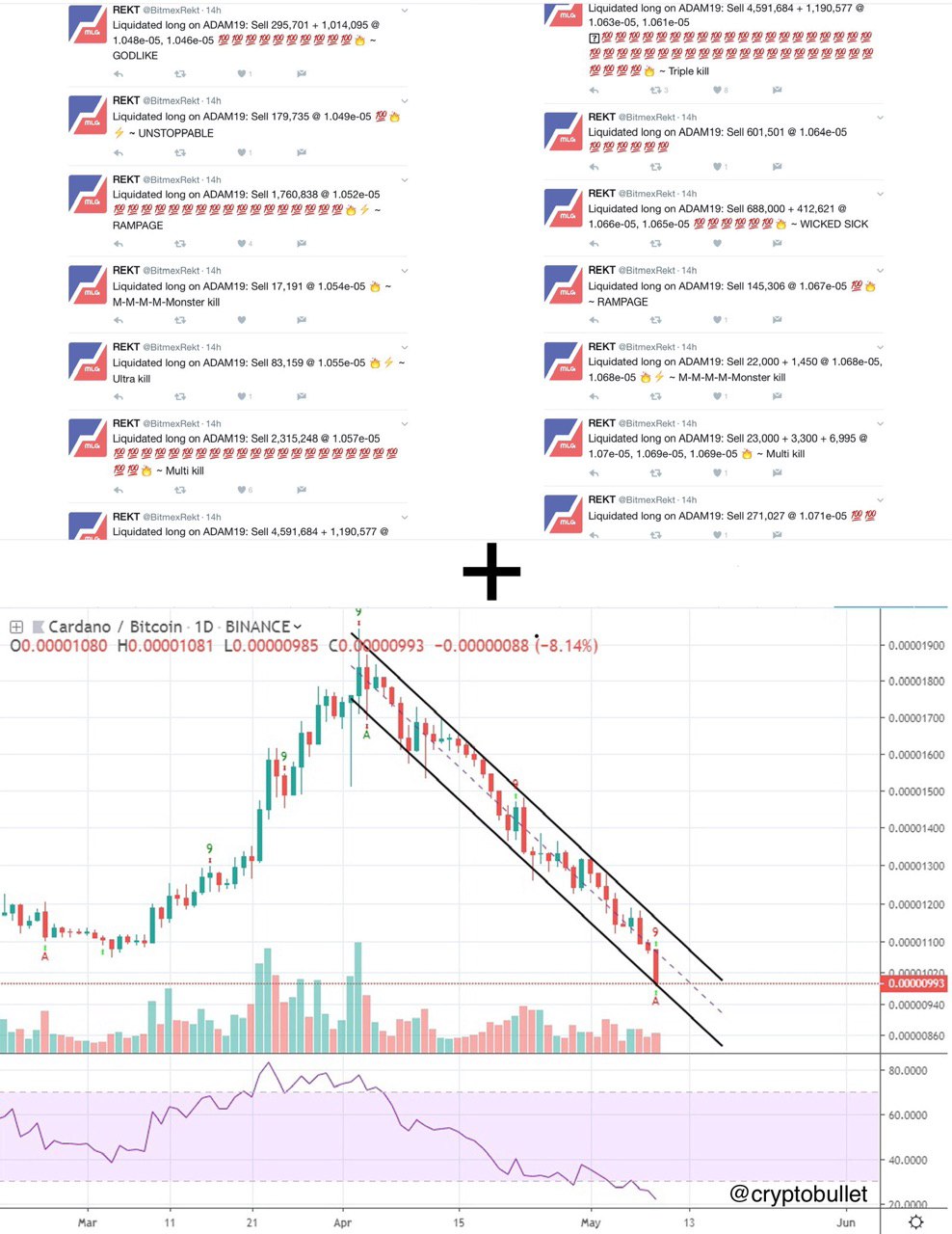 📉 ADA free fall in a descending channel caused huge liquidations on BitMEX. 💡Would suggest that ADA is going to pump like crazy sometime in the next couple weeks - watch this one closely. Right now it's a Falling Knife, let's see where it lands. Current…