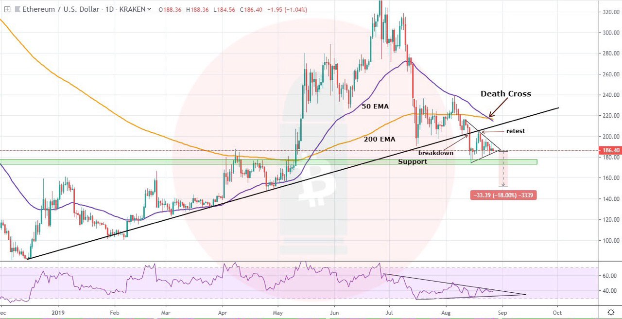 Death Cross between 50 EMA & 200 EMA adds credence to the bearish case.