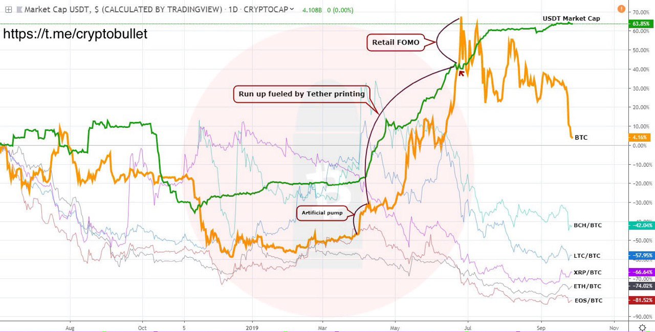Here is the chart of Tether Market Cap, BTC price and top Altcoins in BTC pair.