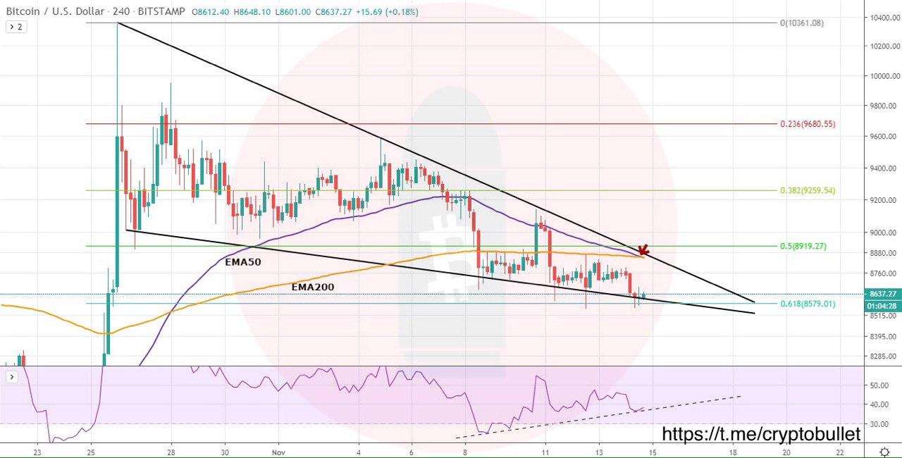 Right know is the decisive moment: either we bounce off of the support line & 0.618 Fib and establish a bull div on RSI or break the support and go to 8200 and lower.