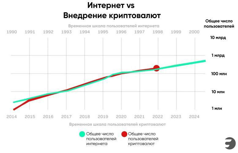 📈Судя по данному графику, криптовалюты дойдут до 1 млрд пользователей в течение 5 лет. На данный момент криптовалютой пользуются столько же человек, сколько интернетом в 1998 году.
