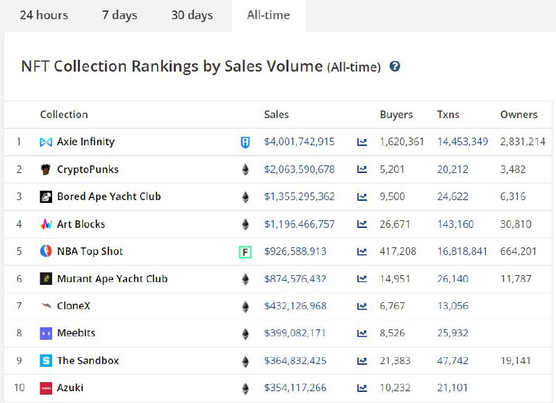 🚀Топовые NFT-проекты по объему продаж за все время.