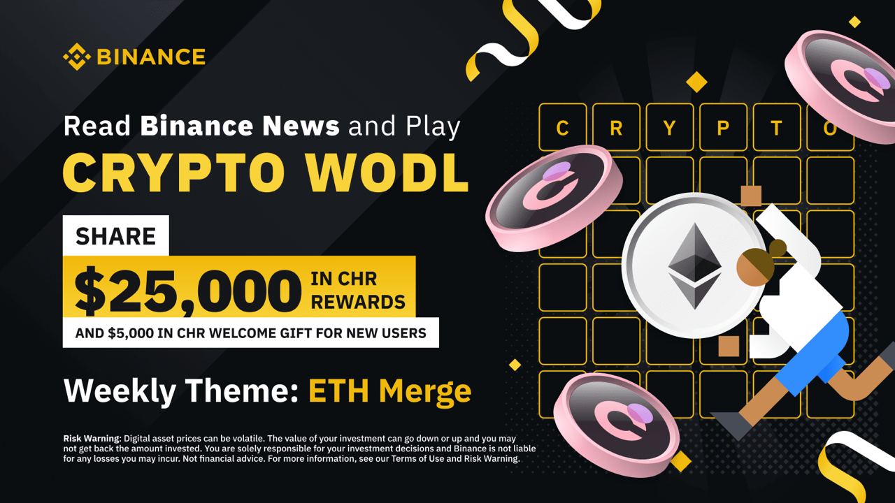 Тема WОDL на этой неделе — ETH Merge. Всё как и в прошлые разы - отвечаем правильно 5 раз и получаем долю от призового фонда ($25000 в токенах CHR) 🤑.