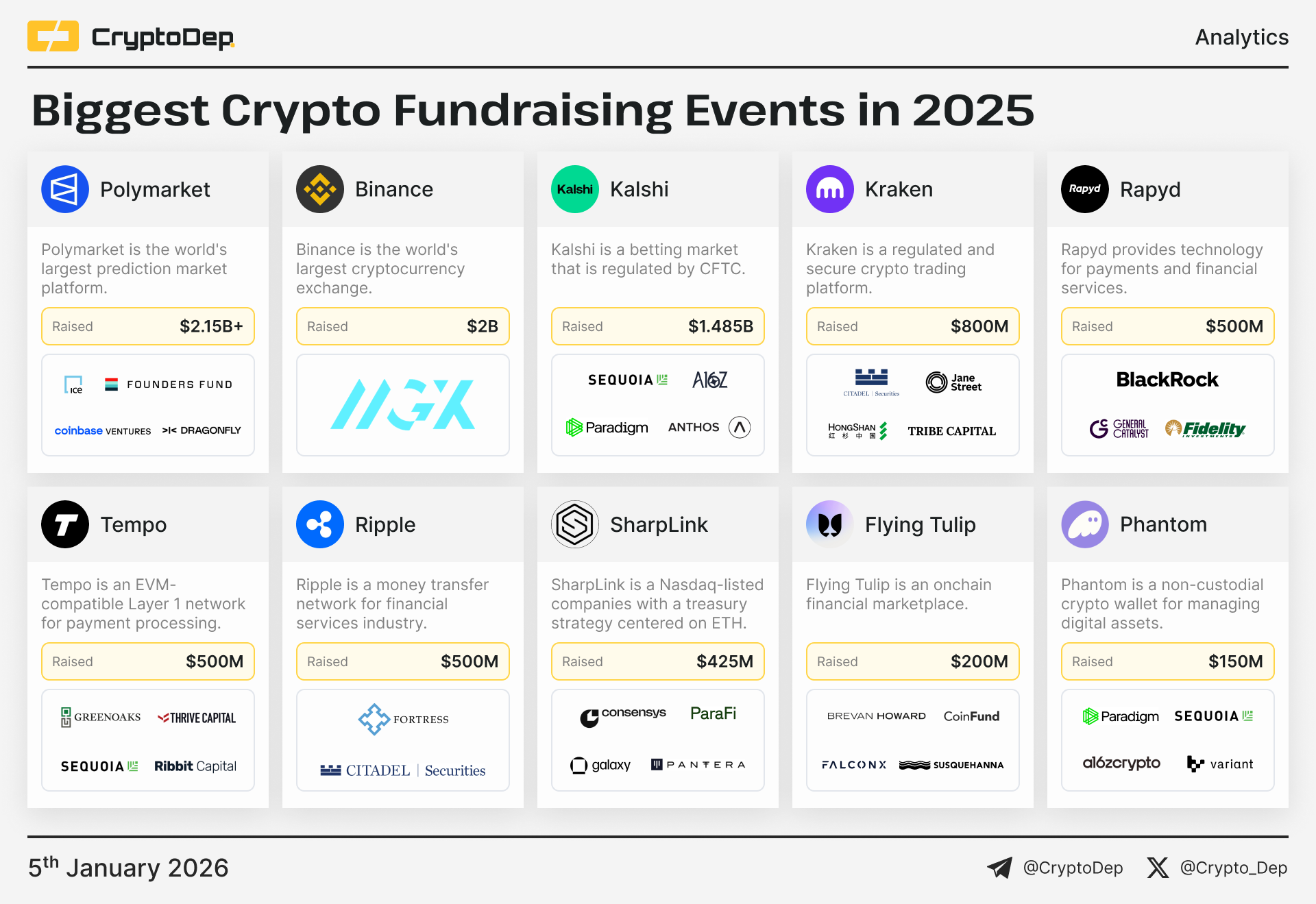 Presenting a list of the biggest crypto fundraising rounds in 2025, backed by well-known investors such as BlackRock, Fidelity, Sequoia, Paradigm, a16z crypto, Pantera Capital, Coinbase Ventures, Consensys, Galaxy, CoinFund, Dragonfly, and others. Let's take a look!