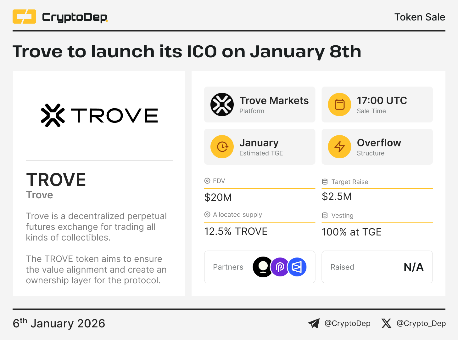 At the start time, the sale will open for contributions with Preferential Allocation mechanic applied. Trove is a perp DEX for collectibles, RWAs, equities, and prediction markets.