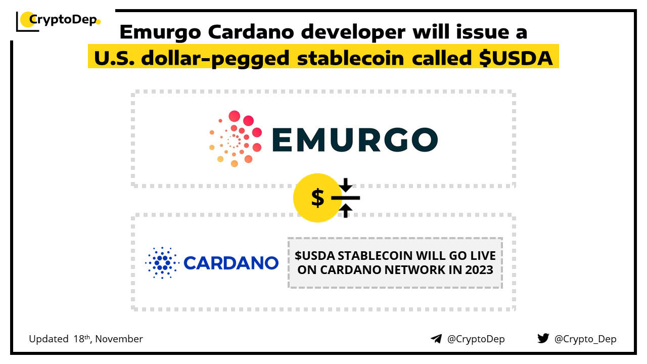 Cardano developer Emurgo has announced the launch of U.S. dollar-pegged stablecoin called $USDA on the network in early 2023. According to the statement, $USDA will be the first regulated stablecoin on the blockchain that is backed by a fiat currency.