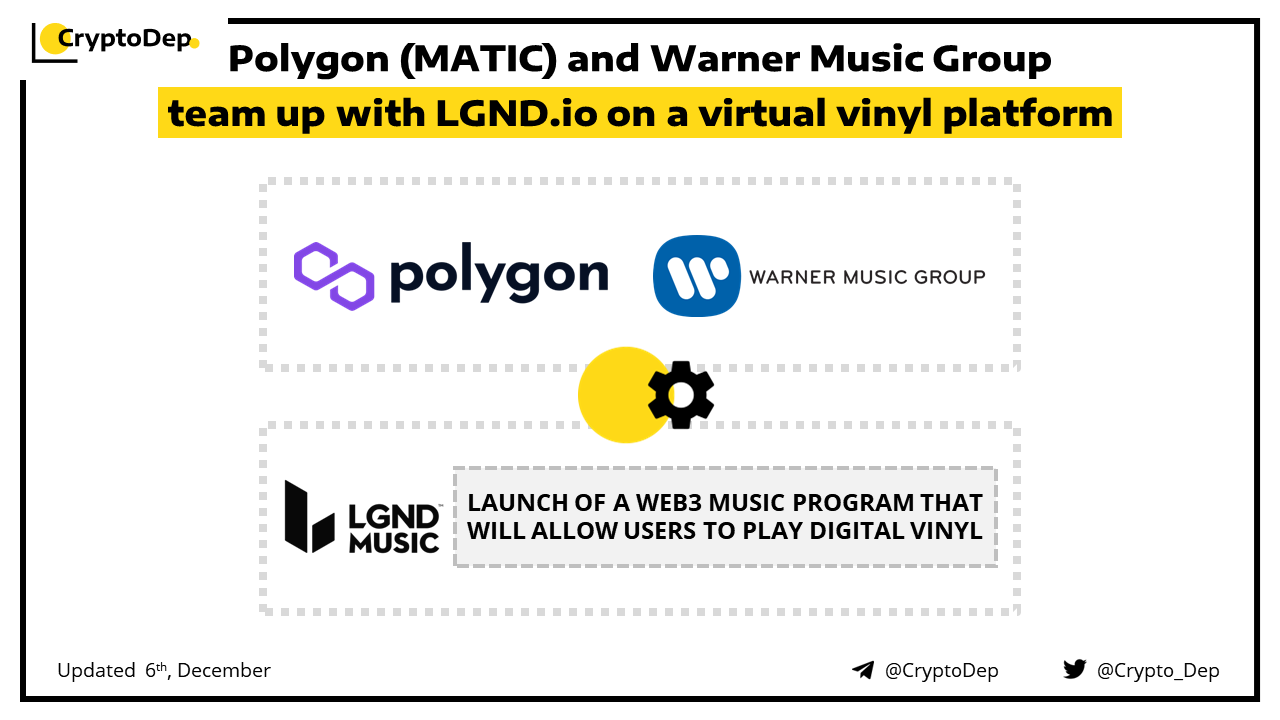 Polygon and Warner Music Group have teamed up with e-commerce platform LGND.іо to roll out a multi-year web3 music program that will allow users to play digital vinyl on the go. The platform, called LGND Music, will support digital collectibles from any blockchain even though it has Polygon as its main partner.