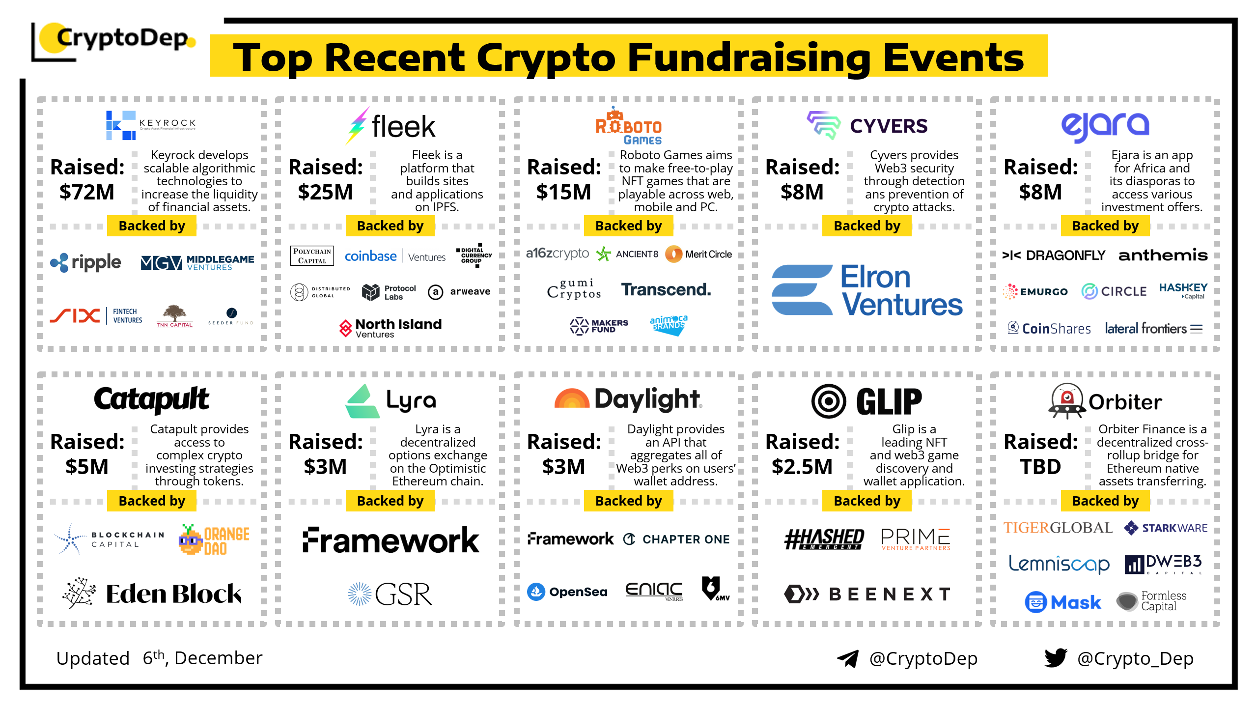 We are excited to present a list of some recent crypto fundraising events, backed by well-known investors such as a16z, Animoca Brands, Polychain Capital, Coinbase Ventures, Circle Ventures, Hashkey, Digital Currency Group, Dragonfly Capital, Hashed Emergent, Framework Ventures, Starkware, OpenSea, Blockchain Capital, Arweave and others. Let's take a look!