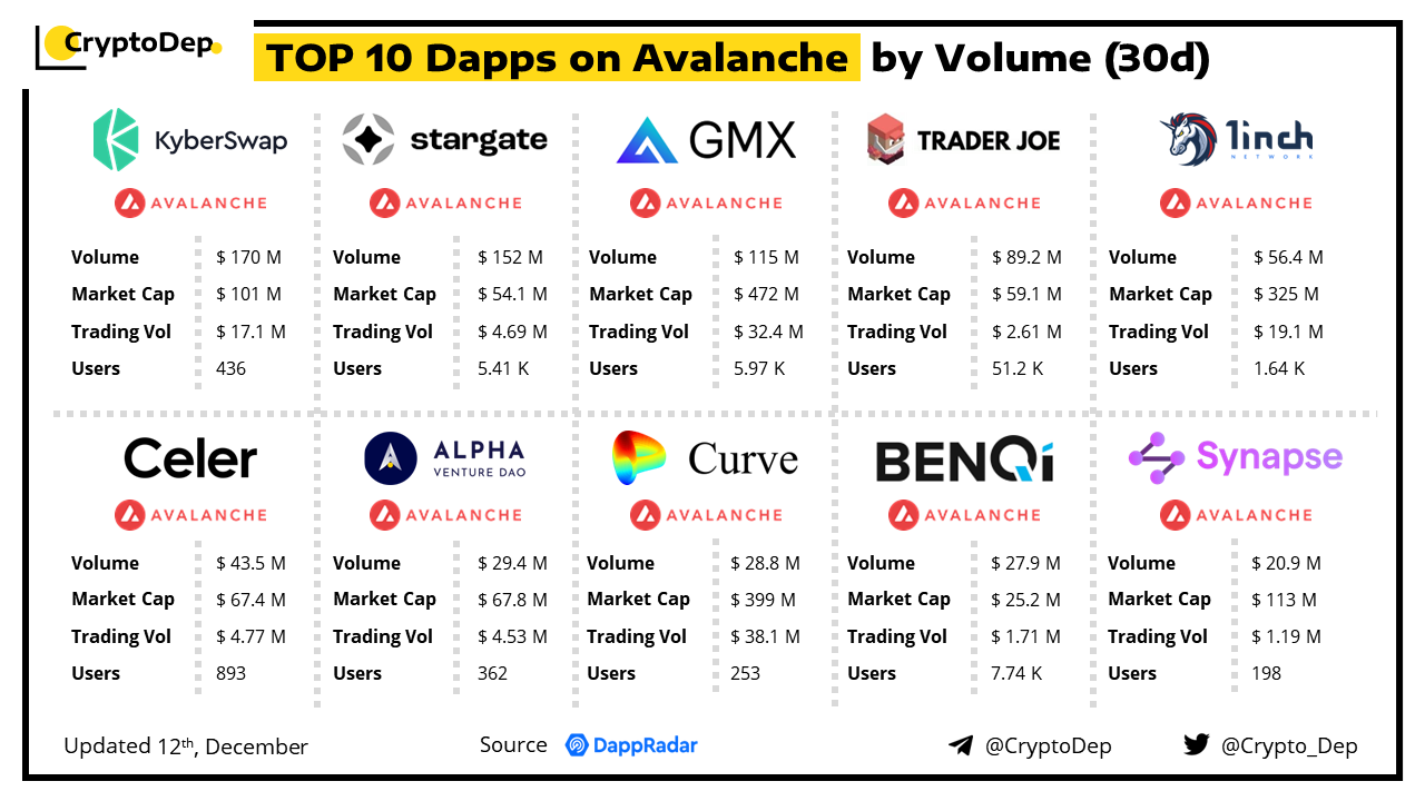 Top 10 Dapps on Avalanche by Volume (30d)