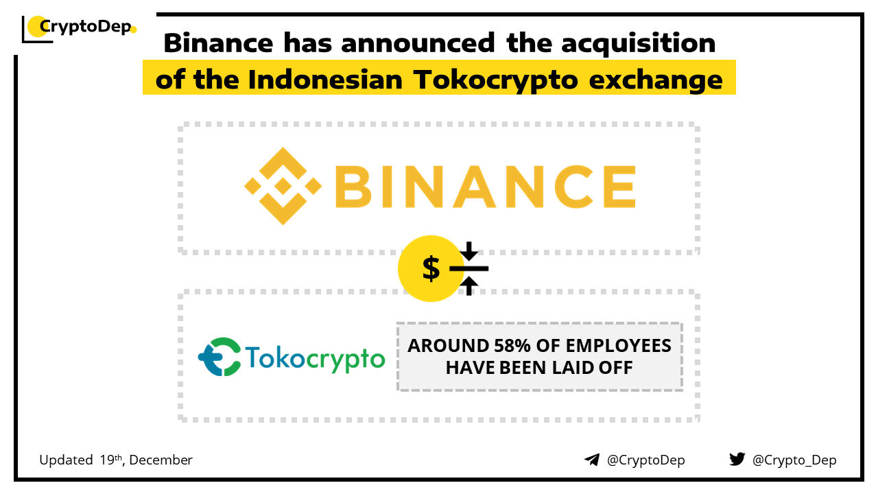 Binance acquires Indonesian crypto-exchange Tokocrypto, laying off 58% of employees. Tokocrypto is intended to focus on business unit exchanges, so business unit operations and activities outside of exchanges will be temporarily halted.