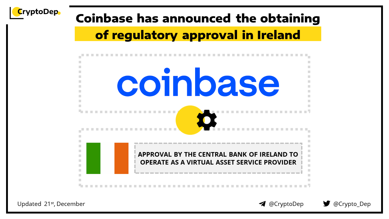 Coinbase has announced the obtaining of regulatory approval in Ireland