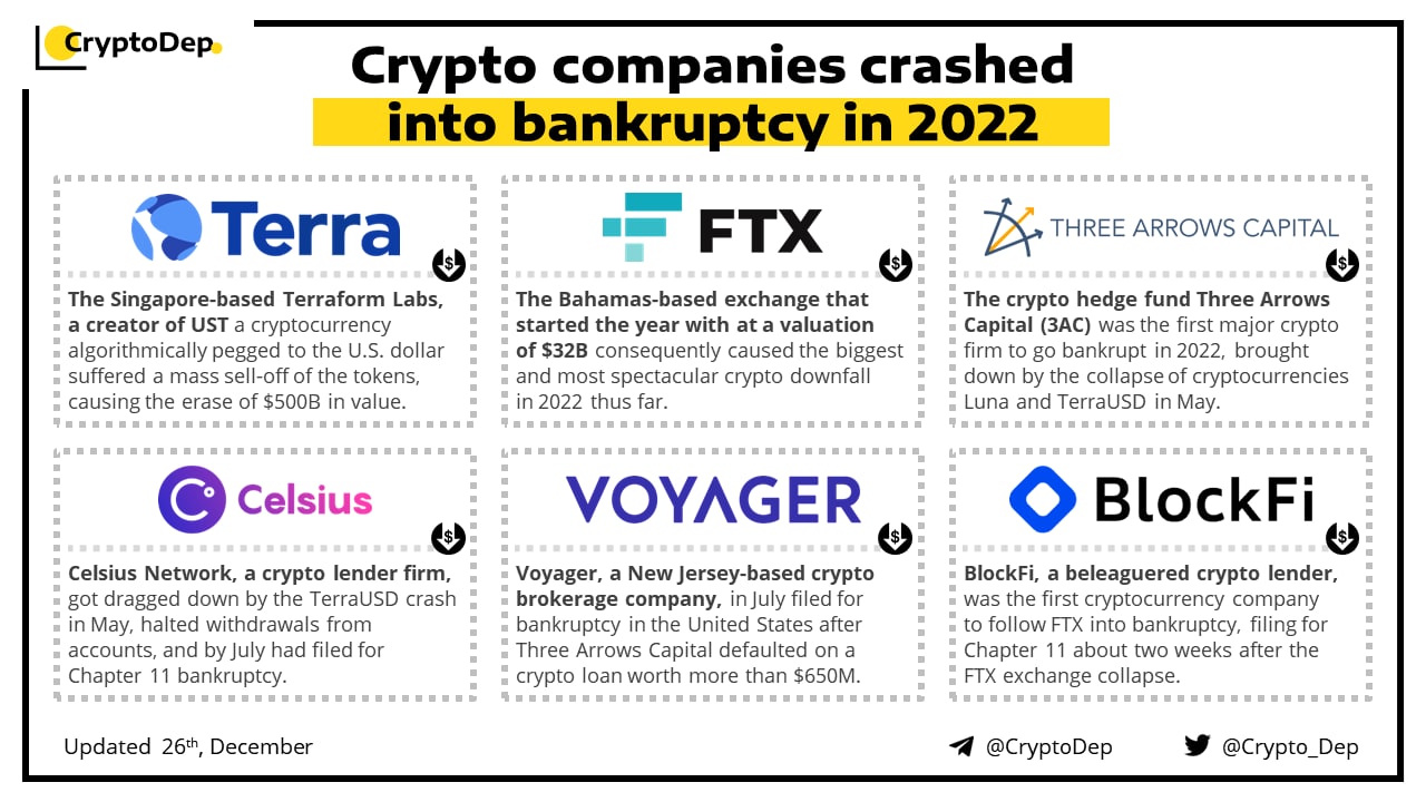 2022 has been a rough year for the crypto industry. The price of bitcoin has dropped 65% since the start of the year, and the whole cryptocurrency market witnessed a series of bankrupts in major companies. Luna suffered a total collapse in value, and crypto exchange FTX went from buying Super Bowl ads to crash landing into bankruptcy.