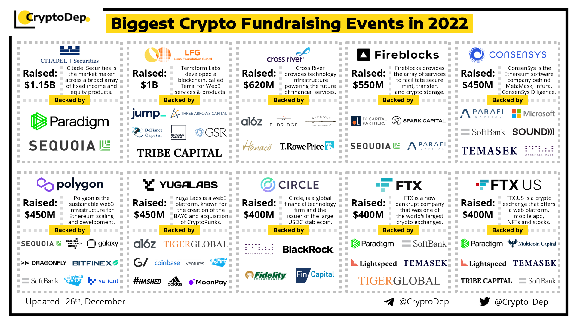 We are excited to present a list of the biggest crypto fundraising events of 2022, backed by well-known investors such as Sequoia Capital, a16z, Paradigm, SoftBank, Galaxy Digital, Bitfinex, Dragonfly Capital, LightSpeed Venture Partners, Jump Crypto, Animoca Brands, Republic Capital, BlackRock, Multicoin Capital and others. Let's take a look!