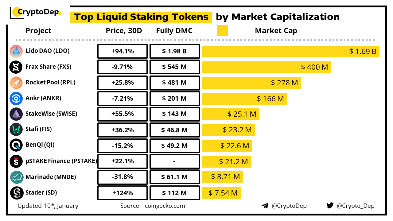 The recently announced Shanghai upgrade of the Ethereum network has had a significant impact on the liquid staking derivatives market, increasing demand for liquid staking derivatives, as more traders and investors look to gain exposure to the staked coin market. We present our cover of the top-performing liquid staking tokens in the crypto market by their market capitalization.