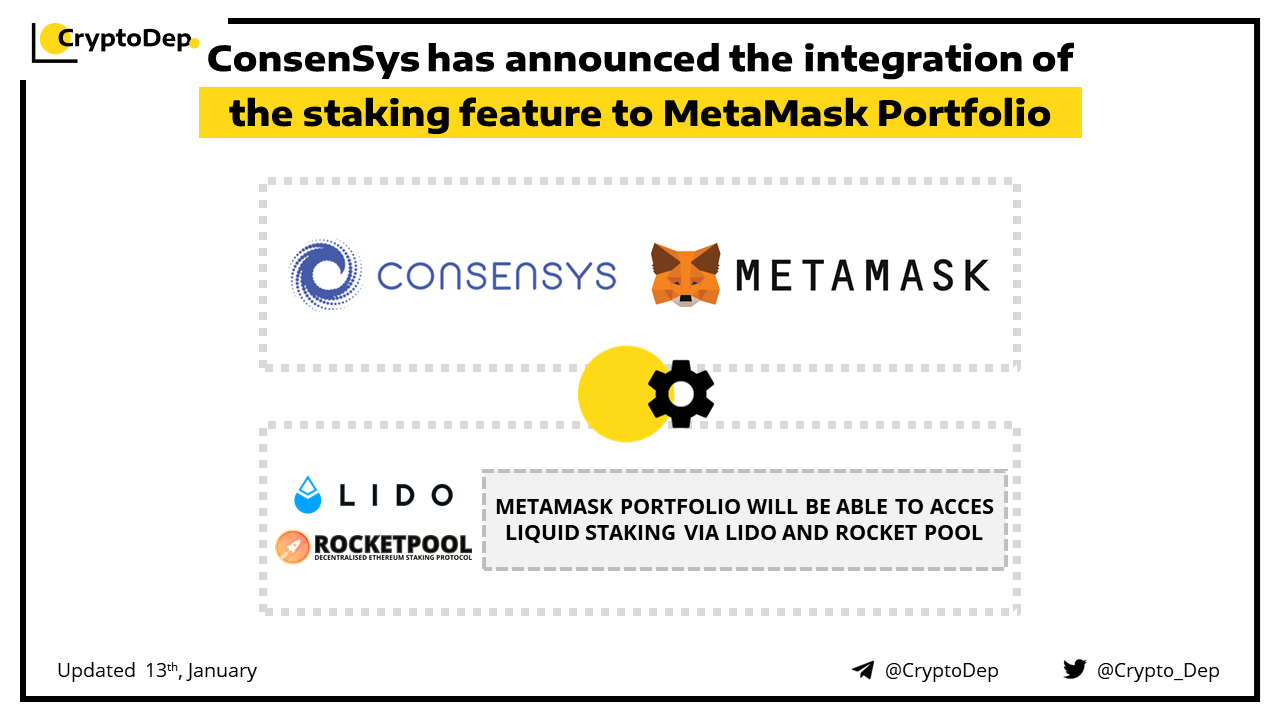 ConsenSys, the company behind MetaMask, will add a staking feature to MetaMask Portfolio. Through this implementation, users can now stake $ETH with Lido or Rocket Pool and receive liquid staking tokens directly from the staking provider within the web3 app.