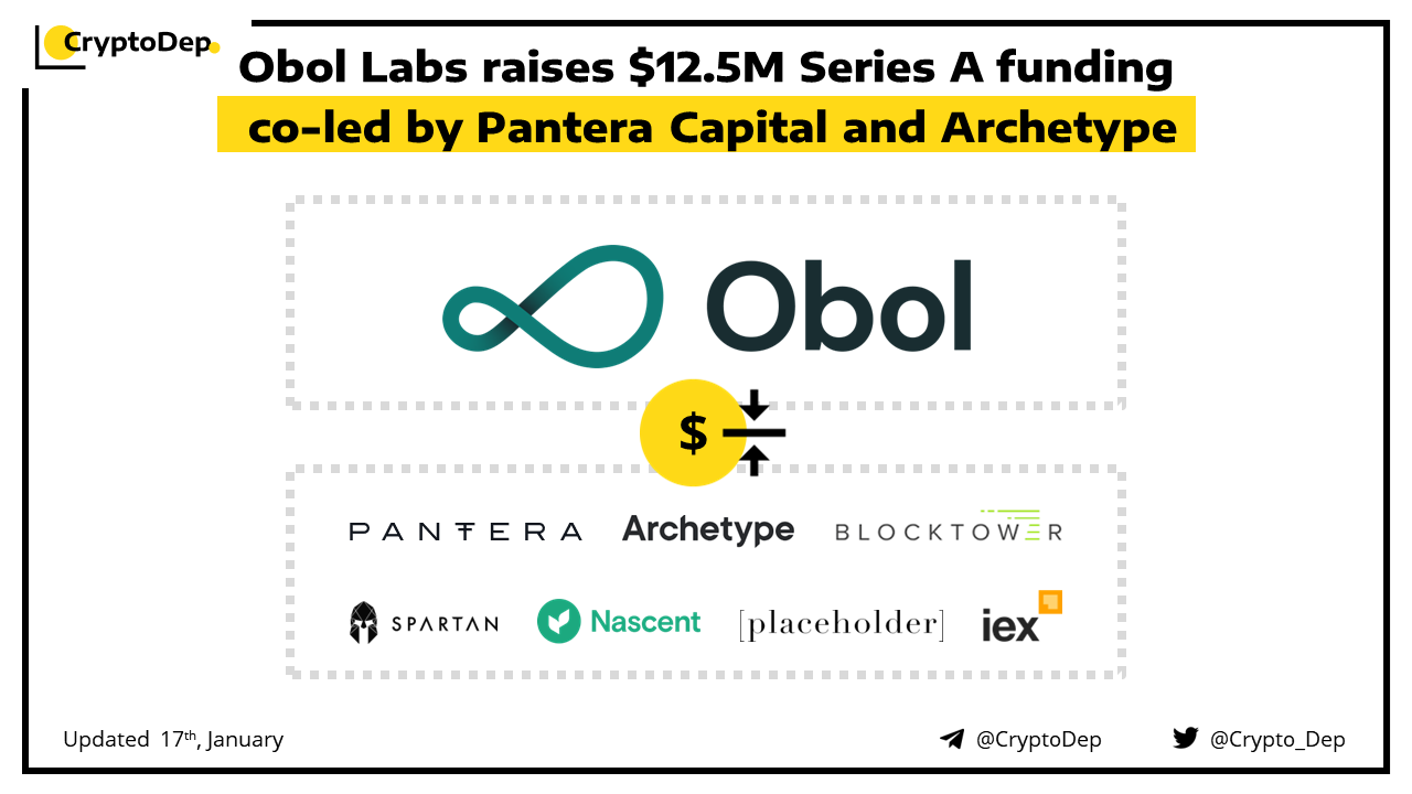 Obol Labs has announced the closure of a $12.5M Series A funding round. Pantera Capital and Archetype co-led the round, with new participation from BlockTower, Nascent, Placeholder, Spartan, and IEX, and follow-on investment from Coinbase Ventures and Ethereal Ventures. The funding is targeted toward building out distributed validator technology (DVT) on Ethereum. The round brings Obol Labs’ total financing to $19M.