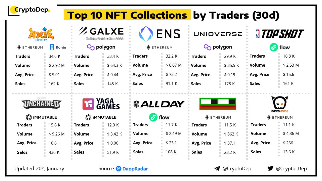 In this post, we analyze top NFT collections by the number of traders in the last 30 days, according to the data from DappRadar. Let's take a look!
