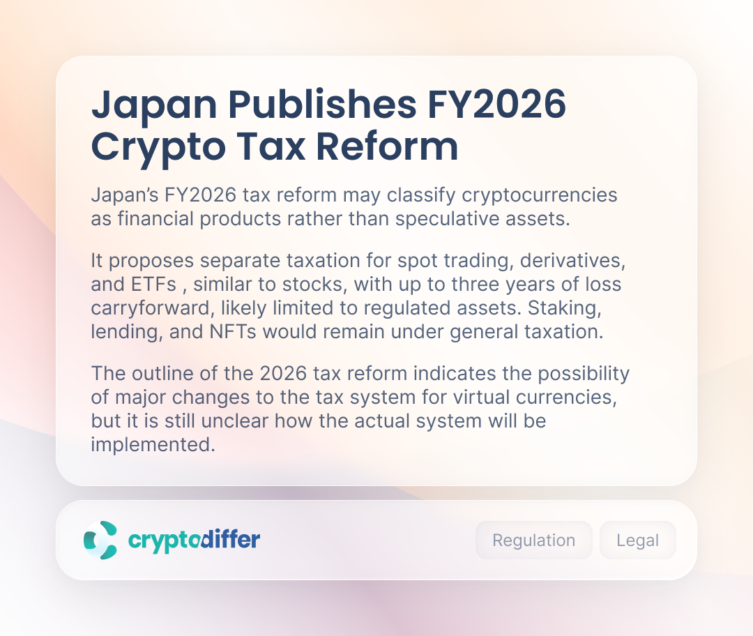 Japan’s FY2026 tax reform plan may classify cryptocurrencies as financial products rather than speculative assets. It proposes separate taxation for spot trading, derivatives, and ETFs , similar to stocks, with up to three years of loss carryforward, likely limited to regulated assets. Staking, lending, and NFTs would remain under general taxation.