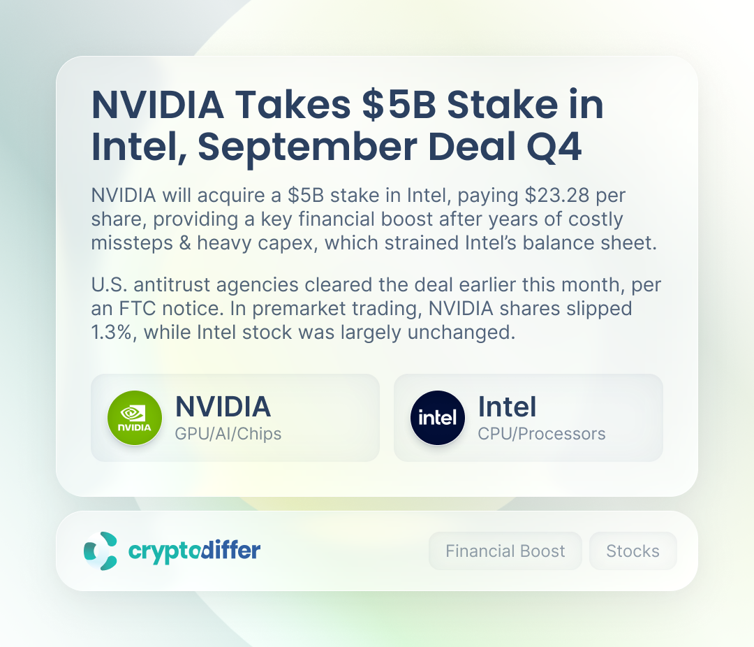 U.S. antitrust agencies cleared the deal earlier this month, per an FTC notice. In premarket trading, NVIDIA shares slipped 1.3%, while Intel stock was largely unchanged.