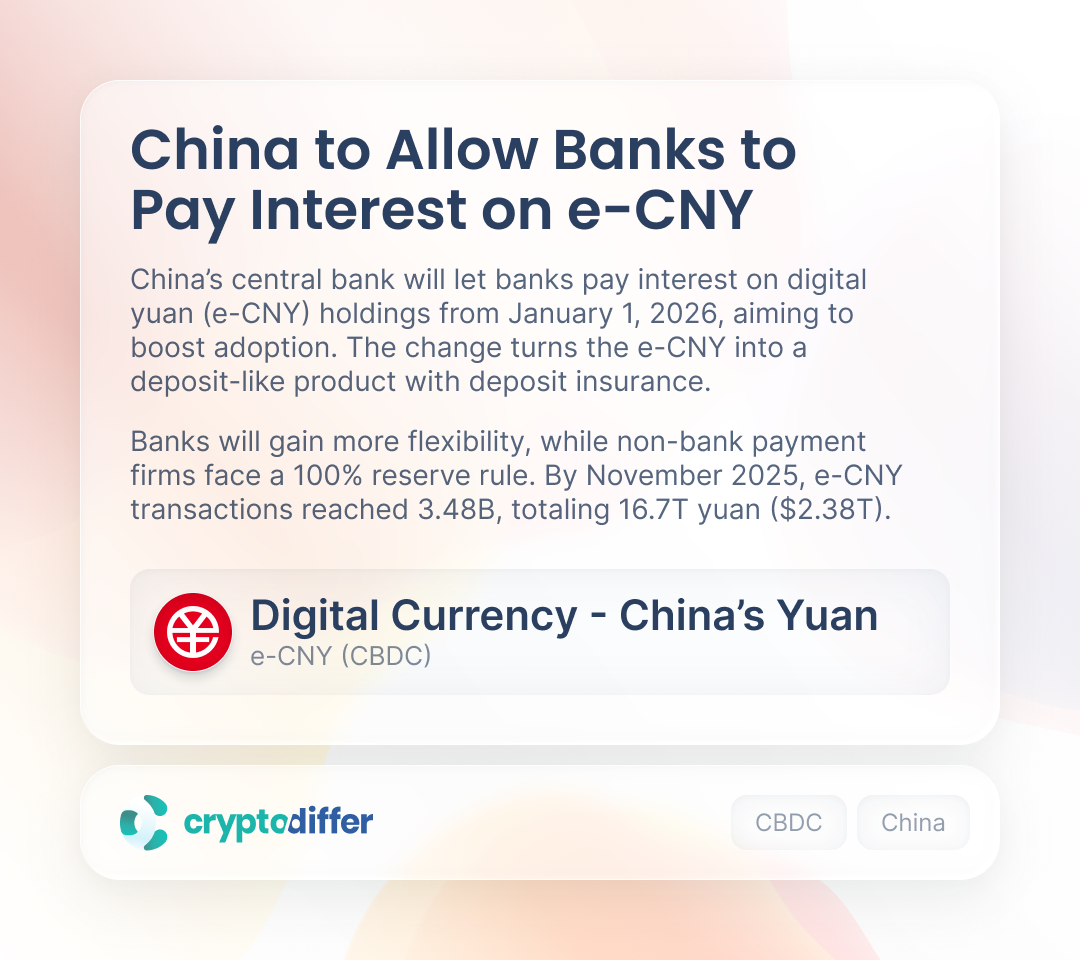 China’s central bank will let banks pay interest on digital yuan (e-CNY) holdings from January 1, 2026, aiming to boost adoption. The change turns the e-CNY into a deposit-like product with deposit insurance.