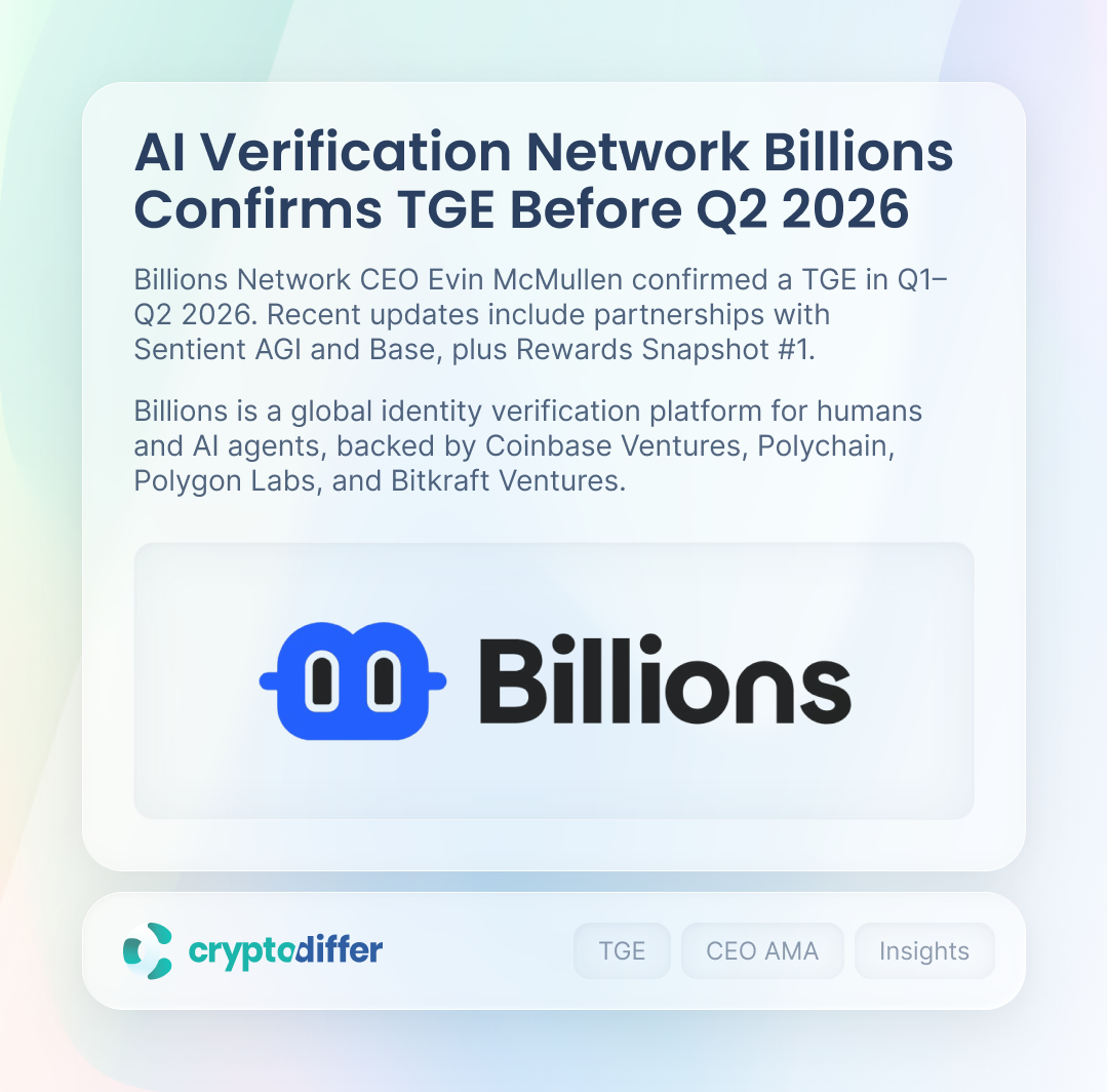 Billions Network CEO Evin McMullen confirmed a TGE in Q1–Q2 2026. Recent updates include partnerships with Sentient AGI and Base, plus Rewards Snapshot #1. Earlier this year, Billions raised $5M via a public sale on Kaito’s Capital Launchpad with a 100% TGE lockup.