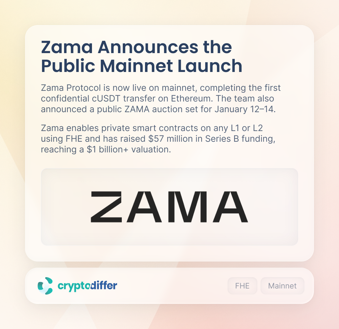 Zama Protocol is now live on mainnet, completing the first confidential cUSDT transfer on Ethereum. The team also announced a public ZAMA auction set for January 12–14, with benefits for OG NFT holders.
