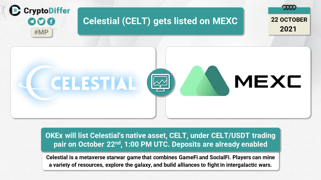 MEXC will list Celestial's native asset, CELT, under CELT/USDT trading pair on October 22nd, 1:00 PM UTC. Deposits are already enabled.