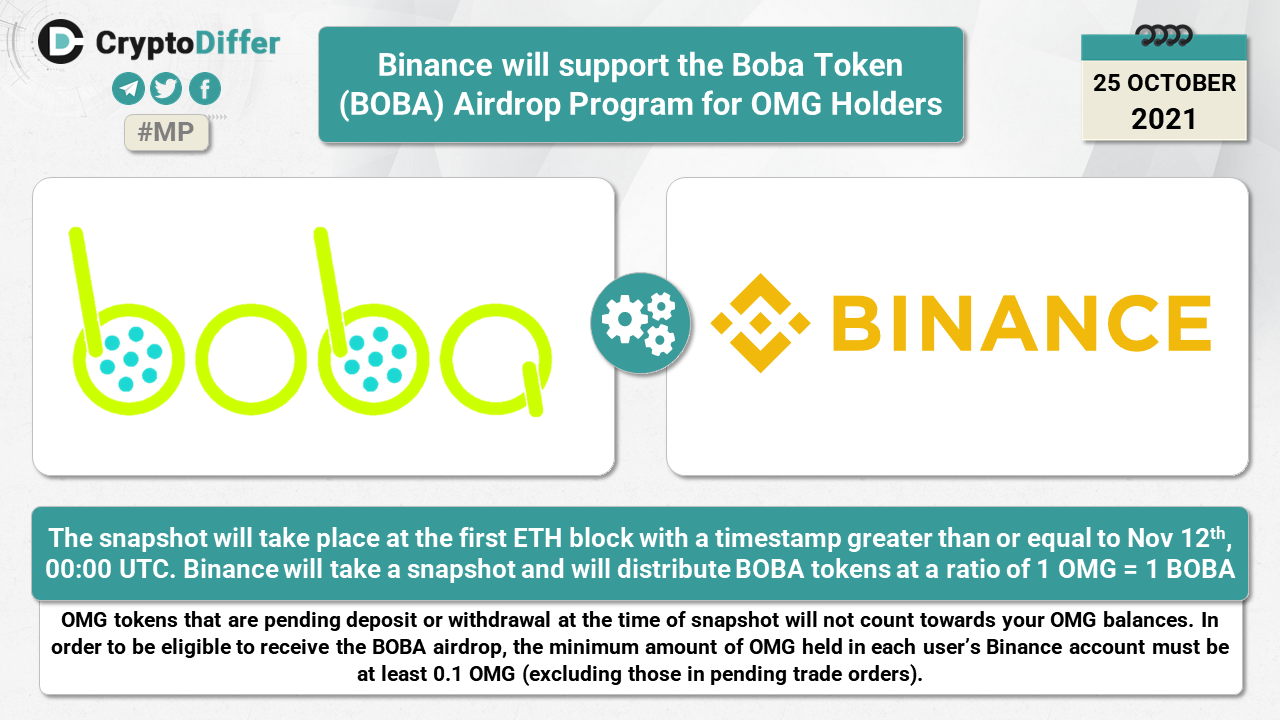 The snapshot will take place at the first ETH block with a timestamp greater than or equal to Nov 12th, 00:00 UTC. Binance will take a snapshot and will distribute BOBA tokens at a ratio of 1 OMG = 1 BOBA.