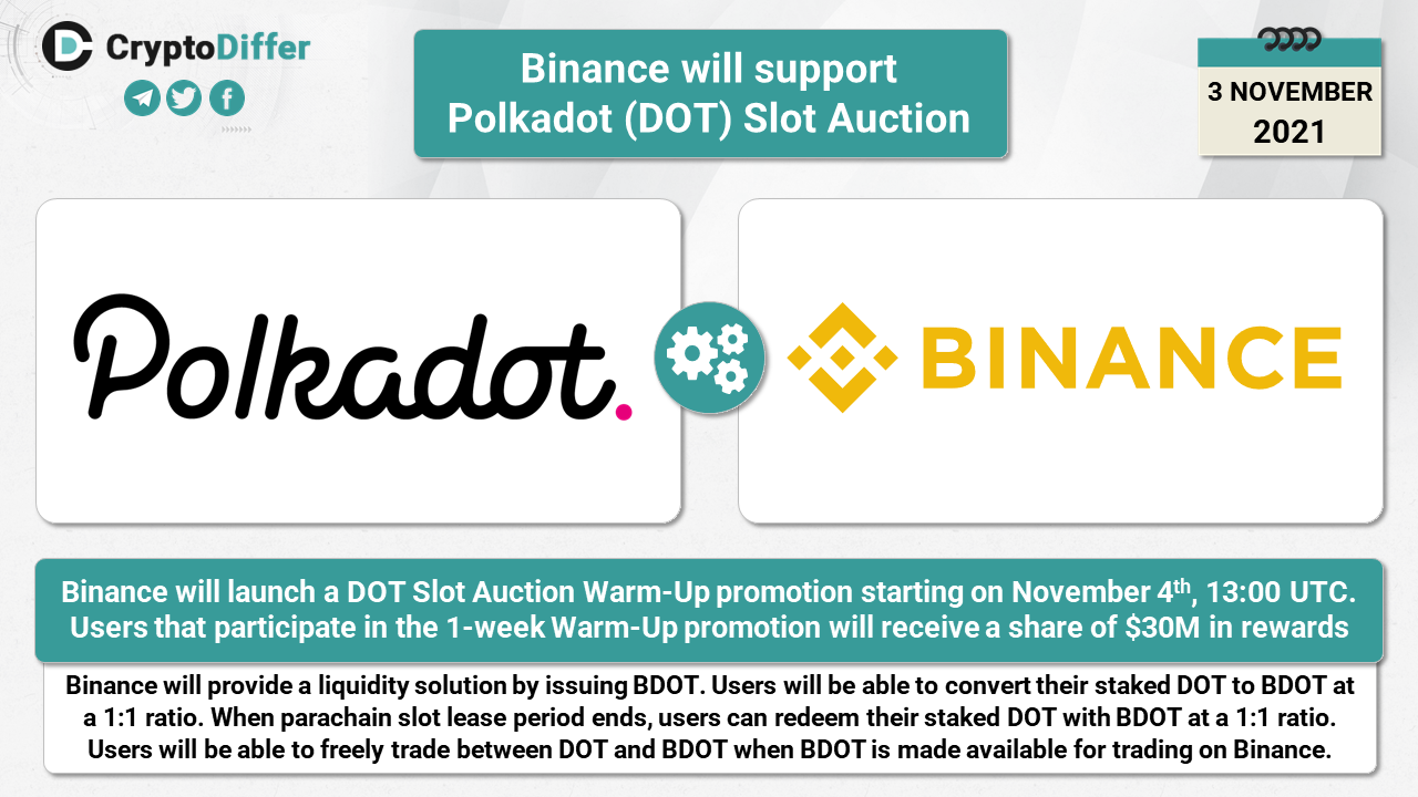 Binance will launch a DOT Slot Auction Warm-Up promotion starting on November 4th, 13:00 UTC. Users that participate in the 1-week Warm-Up promotion will receive a share of $30M in rewards.