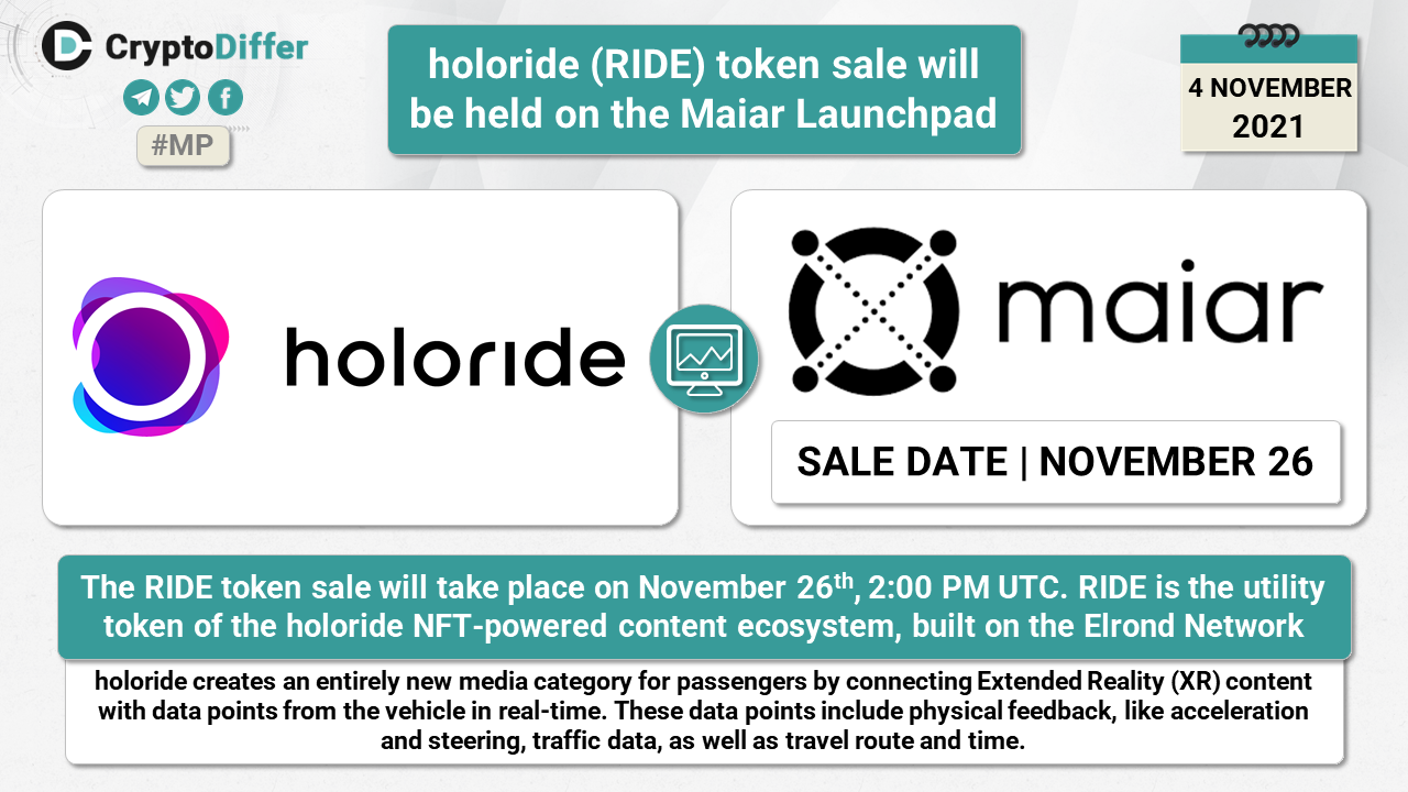 The RIDE token sale will take place on November 26th, 2:00 PM UTC. RIDE is the utility token of the holoride NFT-powered content ecosystem, built on the Elrond Network.