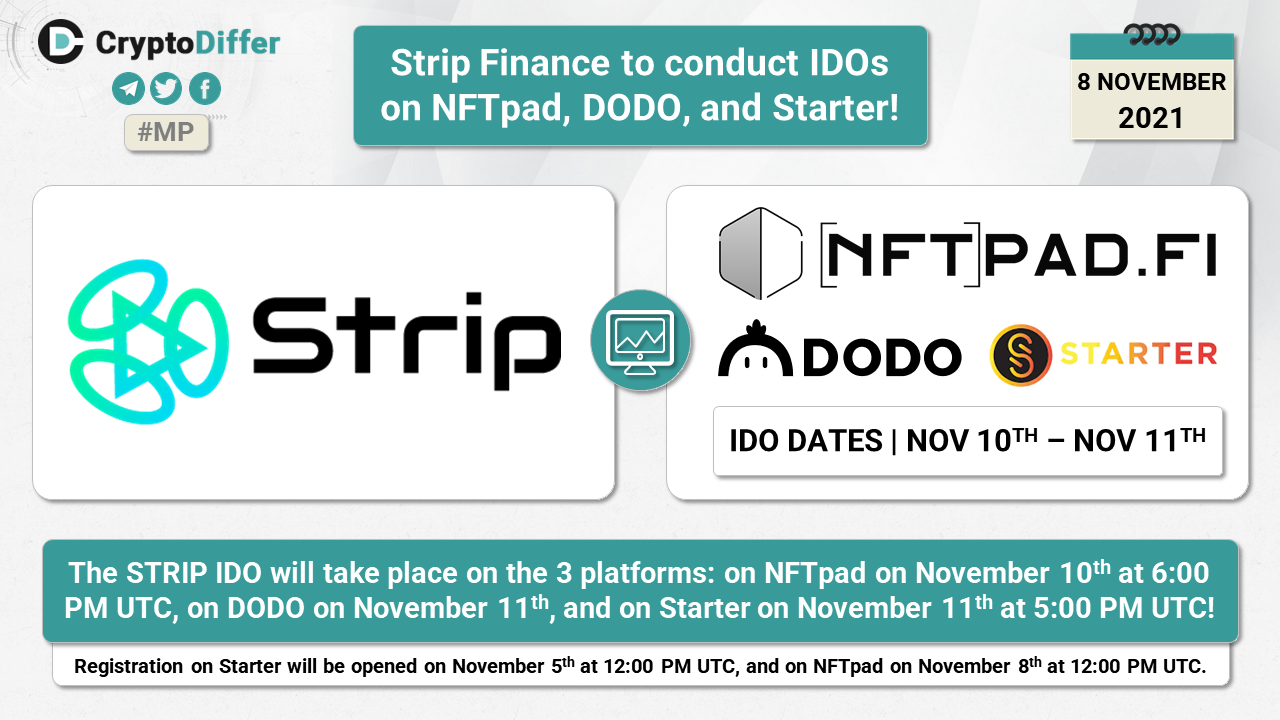 The STRIP IDO will take place on the 3 platforms: on NFTpad on November 10th at 6:00 PM UTC, on DODO on November 11th, and on Starter on November 11th at 5:00 PM UTC.