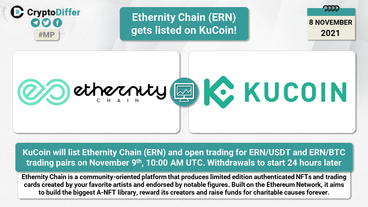 KuCoin will list Ethernity Chain (ERN) and open trading for ERN/USDT and ERN/BTC trading pairs on November 9th, 10:00 AM UTC. Withdrawals to start 24 hours later