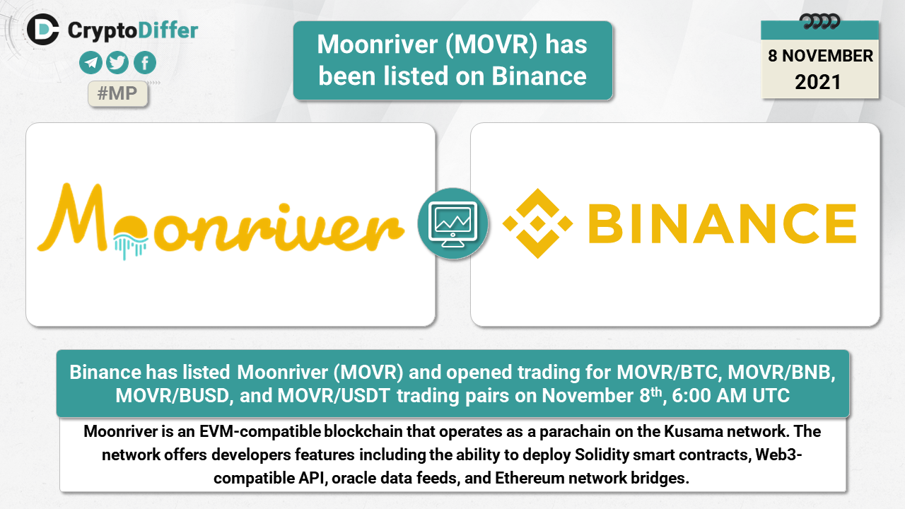 Binance has listed Moonriver (MOVR) and opened trading for MOVR/BTC, MOVR/BNB, MOVR/BUSD, and MOVR/USDT trading pairs on November 8th, 6:00 AM UTC.