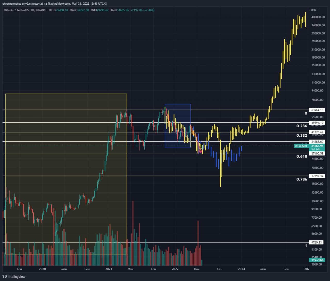 1. Синий прямоугольник – маршрут цены с ноябрьского АТХ до апрельского. Он же, синими барами перенесён в будущее;