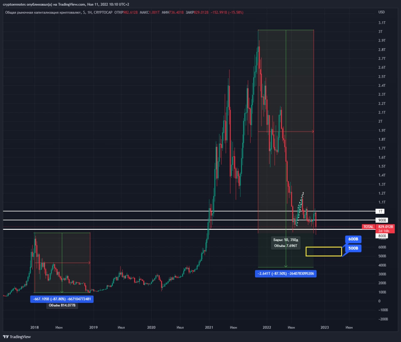 В прошлом цикле (2018-ый год), мы видели падения капитализации на ~85% (с 761млрд до 93 млрд), и аналогичное падение было и по основному активу, Биткойну (с 20,65к до 3,58к). На данный момент максимальное падение от прошлого АТХ составляет ~78%. То есть, по сути, дно уже близко. Но до финального дожатия осталось ещё чуть-чуть - капитализация около 400 млрд. и цена Биткойна 10-11к.