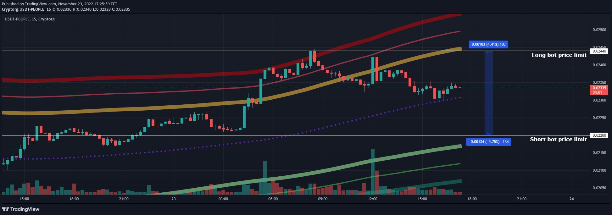 У нас есть #PEOPLE с текущей ценой, и работающим лонговом боте. На пампе, в течении пары минут, цена может сделать х2, дойдя до отметки в 4-5 центов, и если бот работает без ЦО, то он отлично может начать сделку на этих хаях. И если цена вернётся на текущее значение к 2,3 центам, то ты получишь инвест по данной паре. Таким образом, наличие ЦО лонгового бота на уровне 0,0244$ (как на скрине), обезопасит тебя от случайных пампэнддампов.